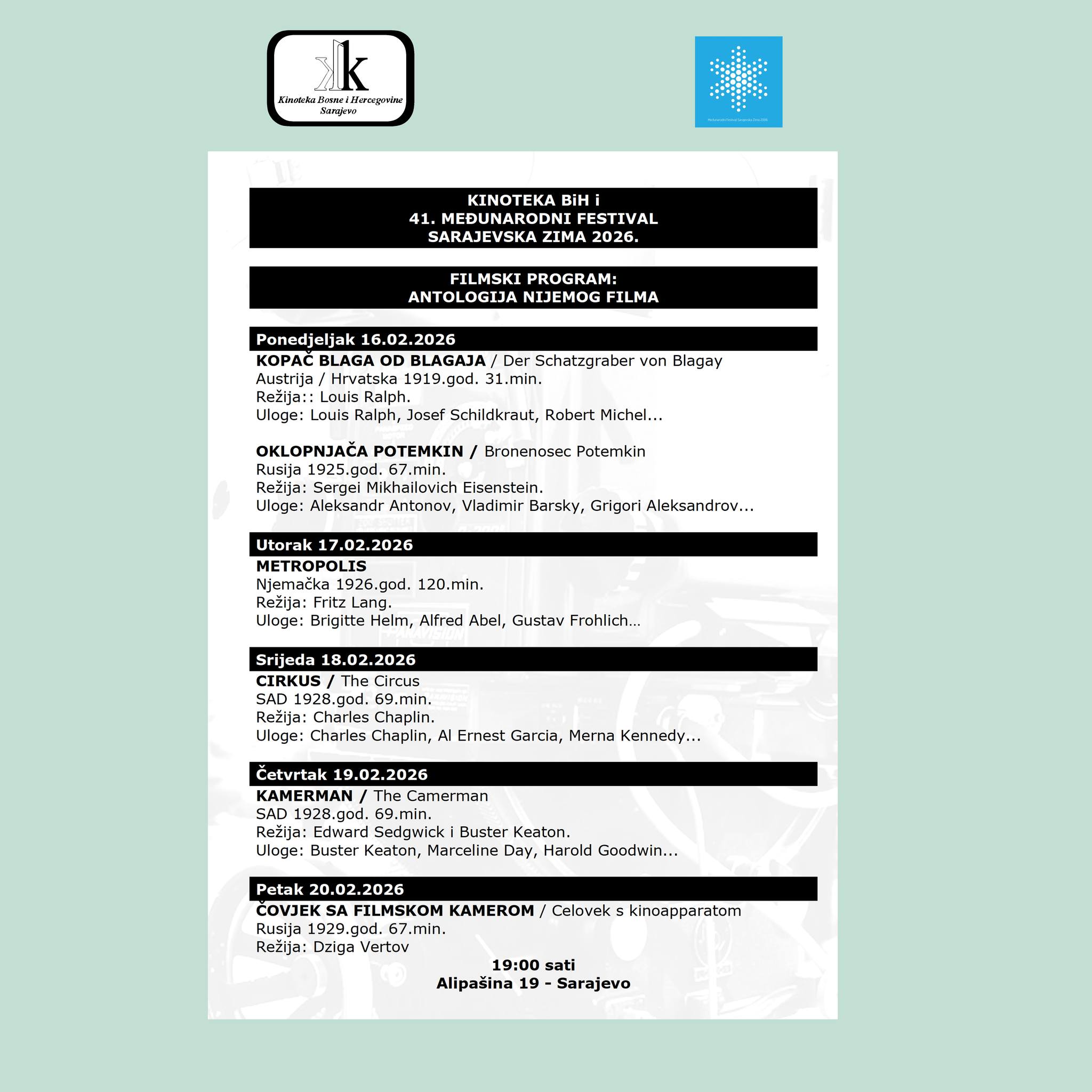 Kinoteka BiH u saradnji sa 41. Međunarodnim festivalom Sarajevska zima 2026. u trećoj sedmici februara u okviru programa “Antologija nijemog filma“ organizuje projekcije nijemih filmova.