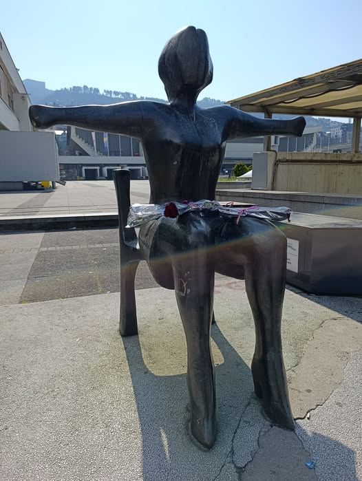 Sretan 8.Mart iz Sarajeva kod skulpture “SUSRET” autora Alije Kucukalica koja je poznata i kao skupltura “Teta razapeta” pozelio je danas u ranim jutarnjim satima Ibrahim Spahic i polozio cvijetove na njena koljena.